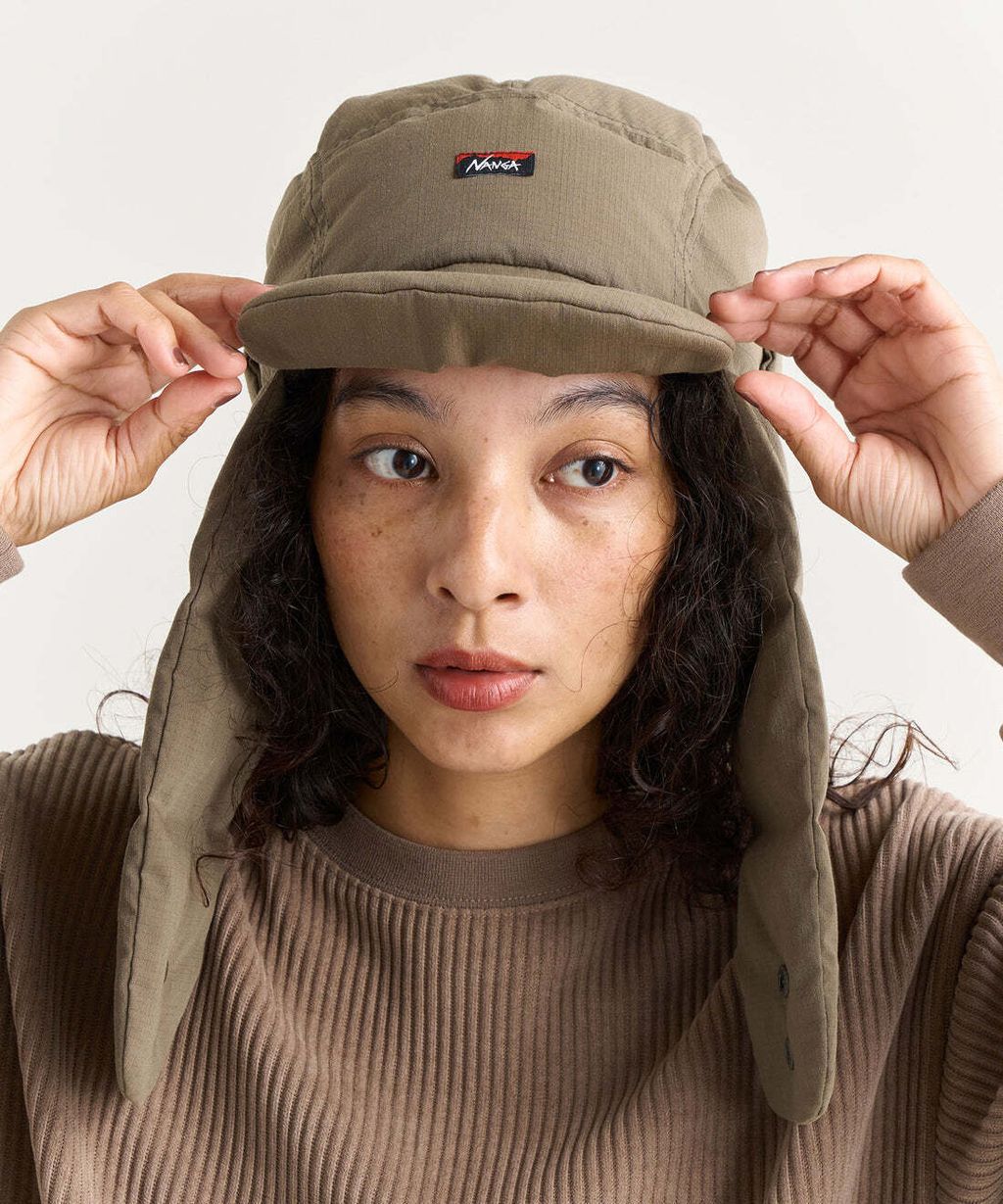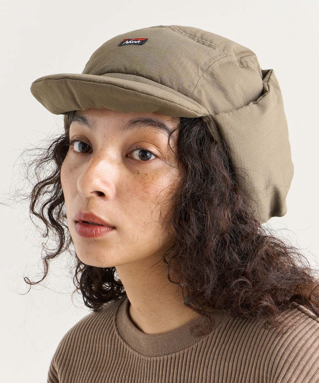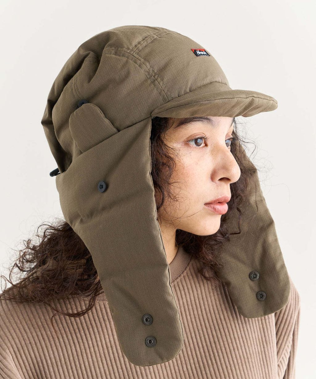 以難燃材質為表布製成的羽絨保暖帽。為減輕重量而使用HINOC RIPSTOP為表布製成的羽絨保暖帽。以Re:CYCLE DOWN (650FP) 的羽絨填充製成兼具防寒與實用性的HINOC RIPSTOP DOWN EAR FLAP CAP,設計上頗具份量感,兩側遮片能完整包覆耳朵與臉部周圍。將兩側遮片解開就能當做日常生活穿搭使用的單品,是戶外活動與休閒皆實用的防寒單品,泛用性強,不分性別皆適用。
