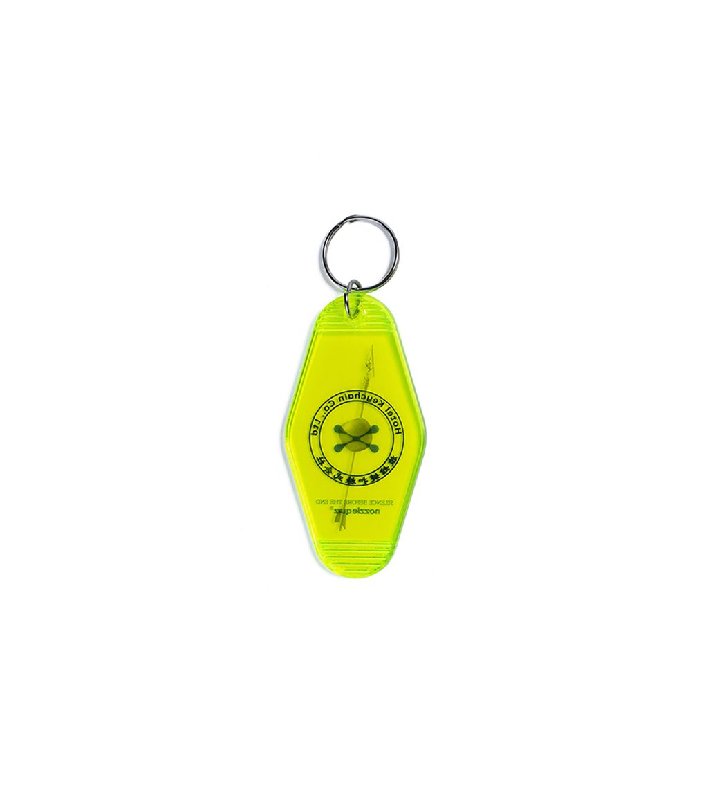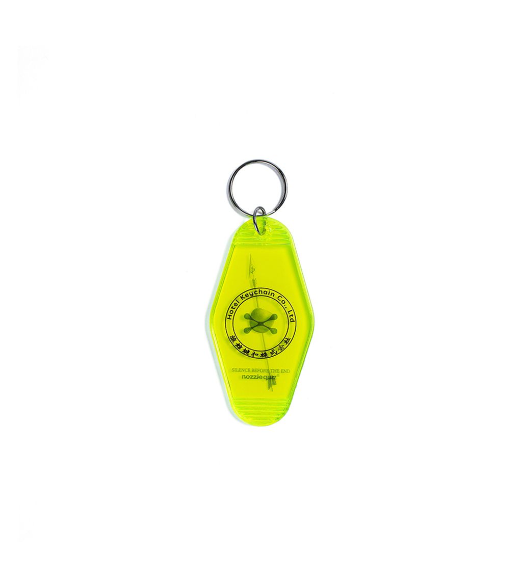 nozzle quiz® 攜手創意單位 San 打造 Trojan 夏季膠囊限定周邊。這款鑰匙圈延伸末世主題,以 Hotel Keychain 經典輪廓重塑警告訊號。雙面設計:正面是 nozzle quiz® 與 X 形標誌,背面則出現形似「Zombie dragon」的異種形體與 Trojan 字樣,像是未來文明留下的符號密碼。