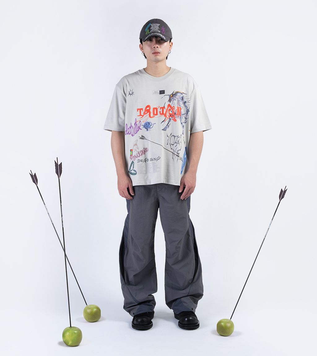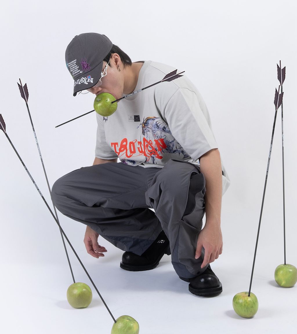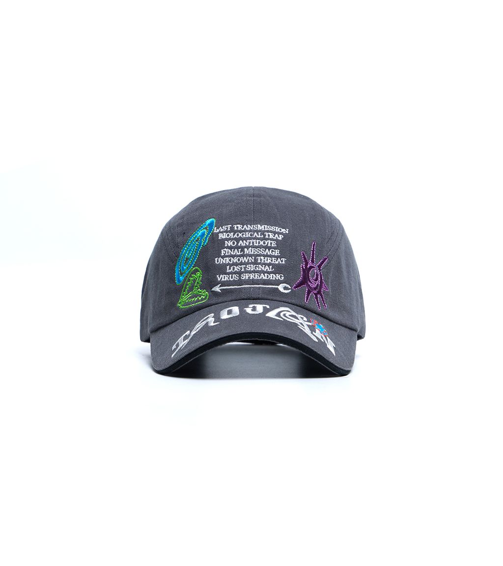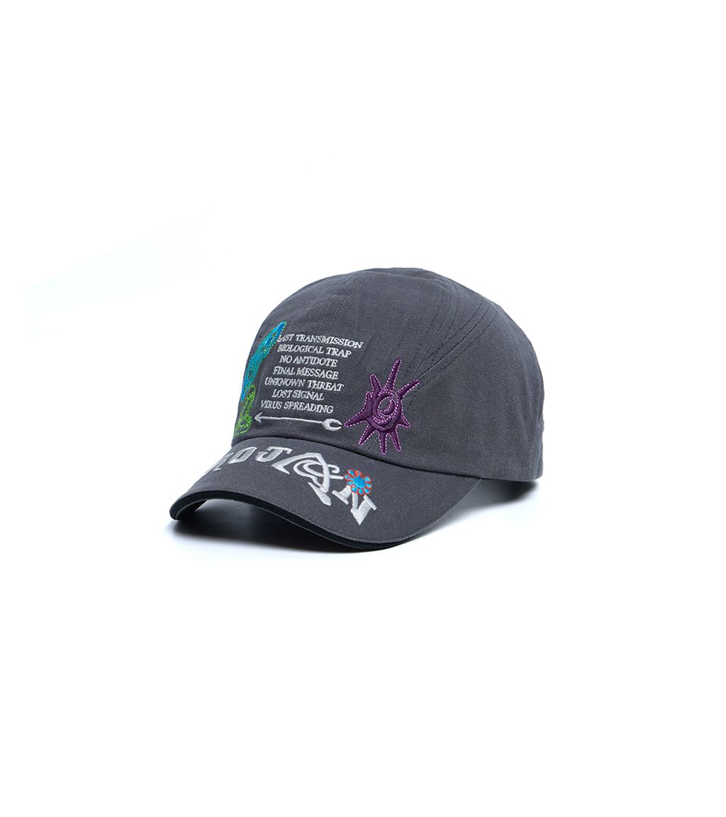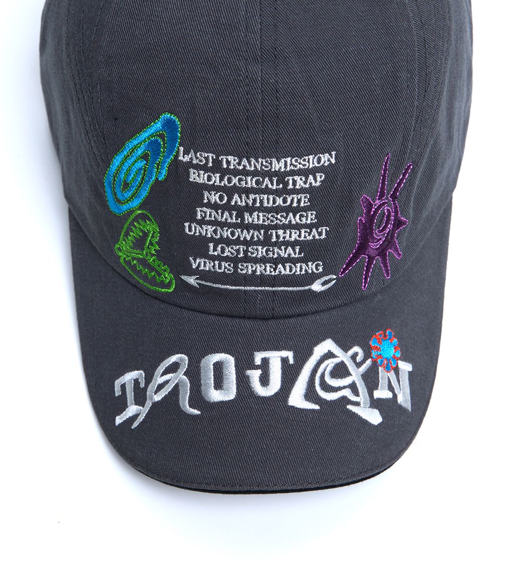 Trojan Splice Cap 採用全新調整的帽型結構,輪廓更加流線俐落;正面大面積圖像電繡將陷阱、怪物、求救訊號等符碼直觀呈現,彷彿一場潛藏風暴的開場白。