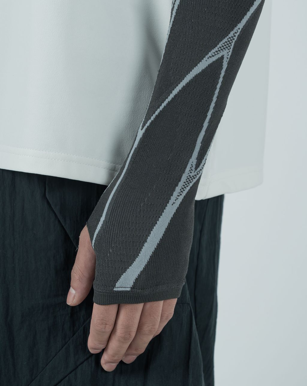 • 拇指岔孔與輪廓線條:增加手掌防護範圍並穩定袖身,動態視覺線條同時修飾手臂輪廓。