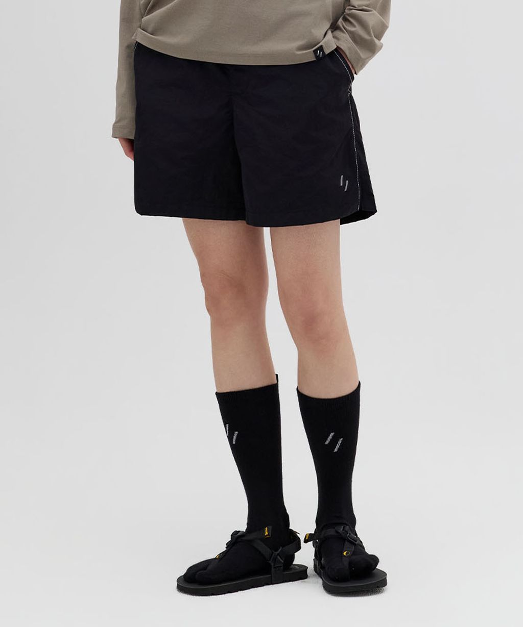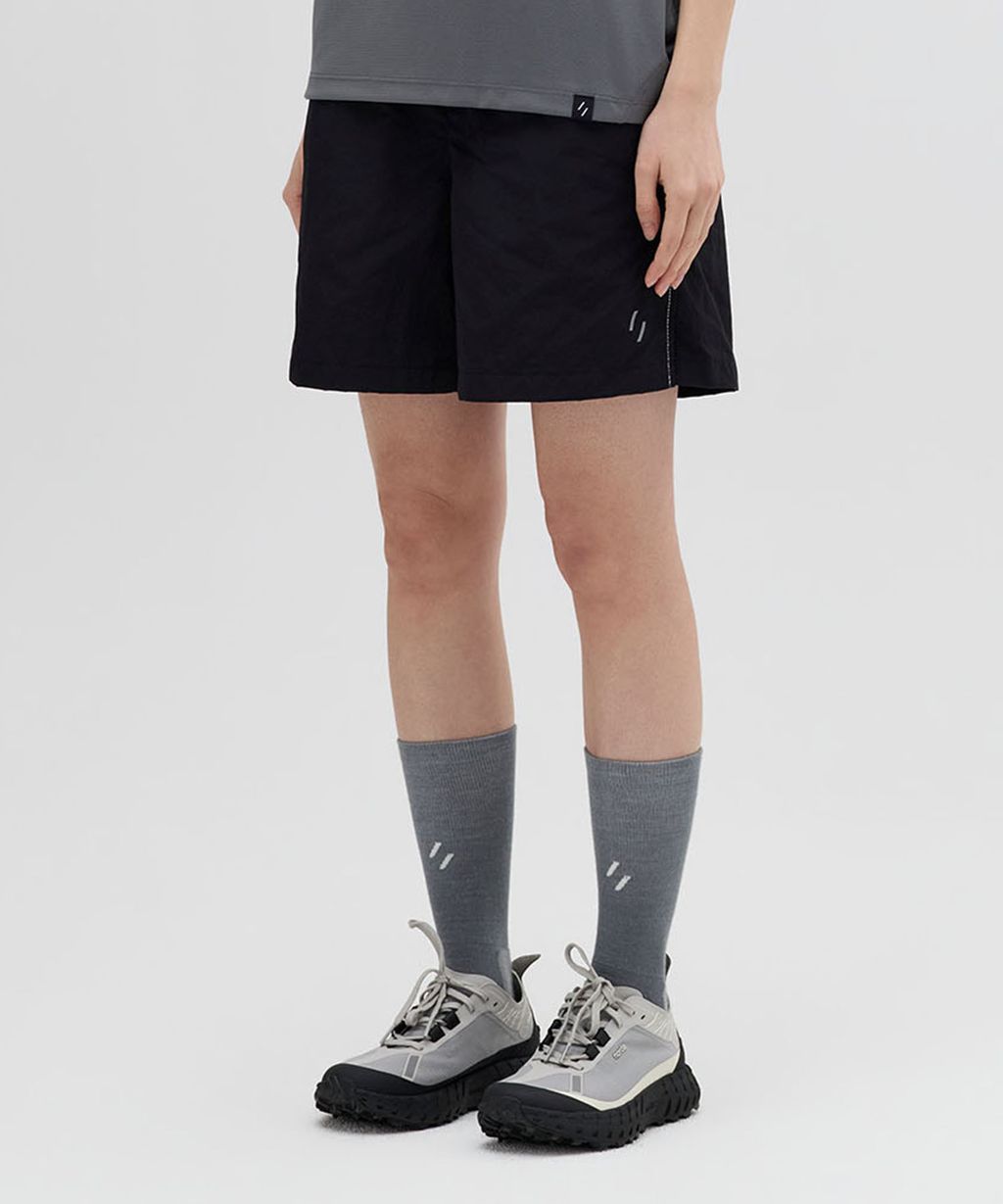 這款短褲採用尼龍塔絲隆(Nylon Taslan, 135gsm)布料製成,具備輕盈且耐用的特性。細節上搭載 YKK 拉鍊與 Woojin Plastic 配件,確保使用的可靠性。腰部設有可調節的織帶腰帶,可依需求輕鬆調整鬆緊。安全設計包含反光印花與反光孔眼細節,提升了在光線不足環境下的可視性。