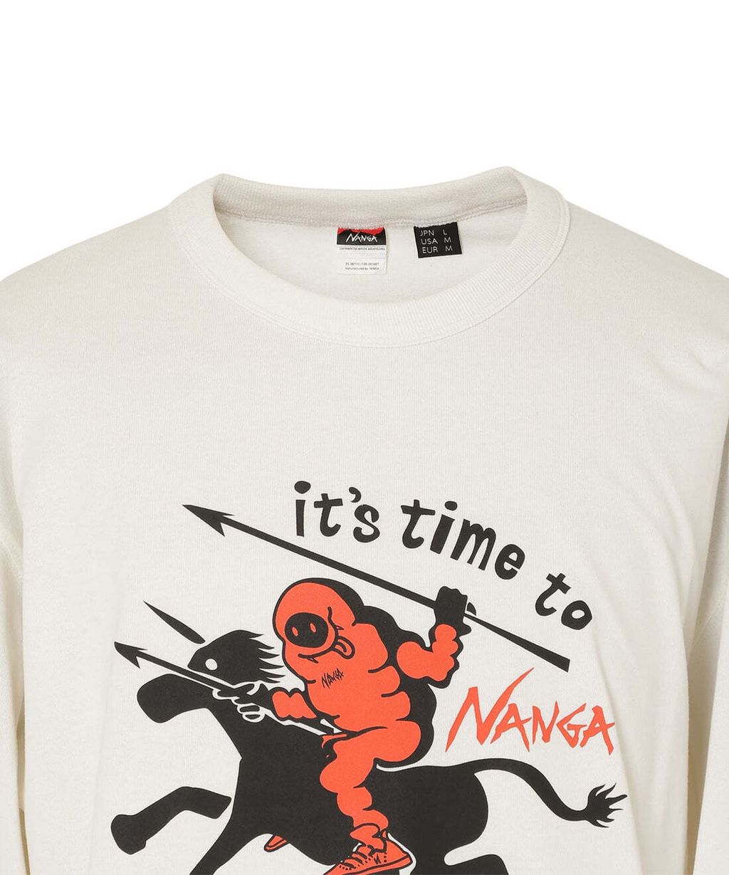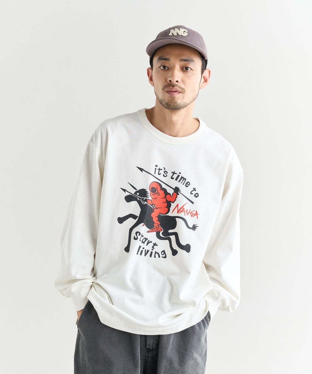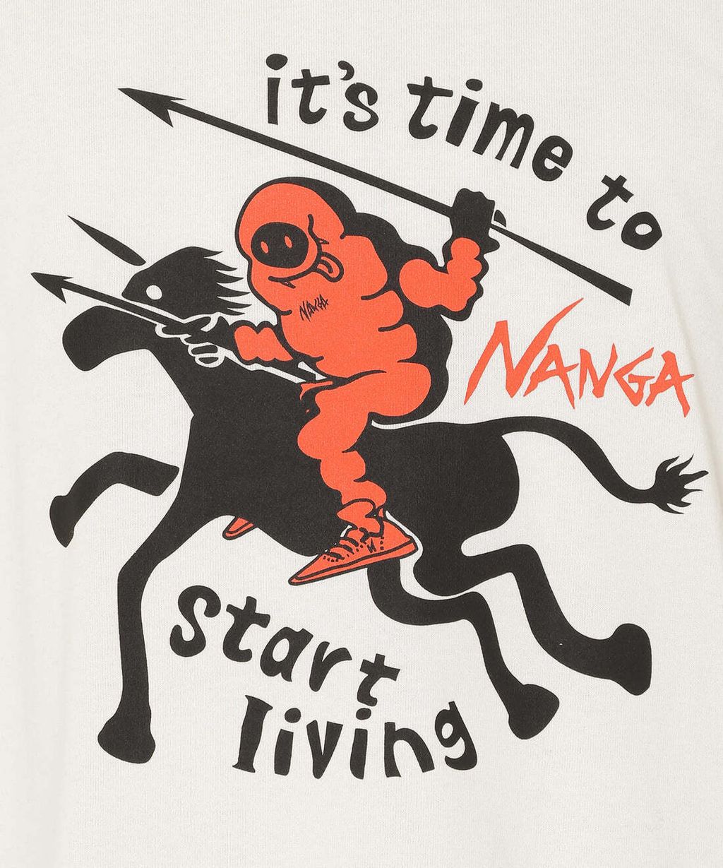 以品牌象徵性的「睡袋人」為主題,將騎著馬、手持長槍的 Down Man 圖像大面積印於正面,搭配「It’s time to start living(現在正是開始生活的時刻)」字樣,傳遞出勇於行動與探索的精神。整體以幽默感與冒險意象融合的設計,展現 NANGA 一貫的遊戲感與創造力。