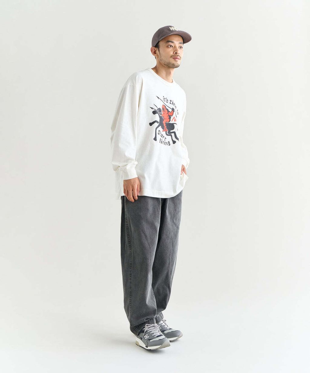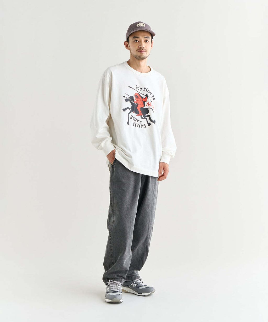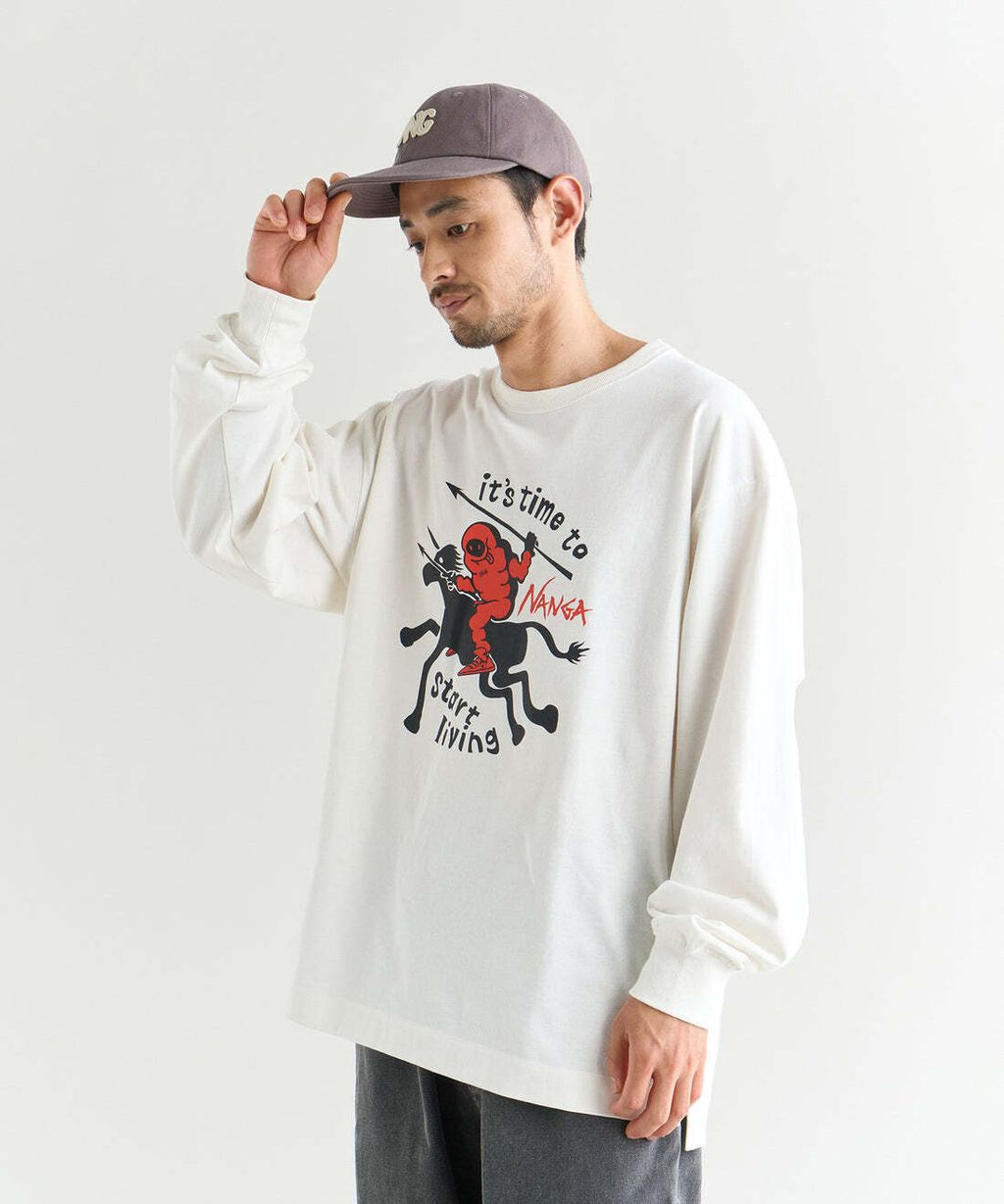 以品牌象徵性的「睡袋人」為主題,將騎著馬、手持長槍的 Down Man 圖像大面積印於正面,搭配「It’s time to start living(現在正是開始生活的時刻)」字樣,傳遞出勇於行動與探索的精神。整體以幽默感與冒險意象融合的設計,展現 NANGA 一貫的遊戲感與創造力。