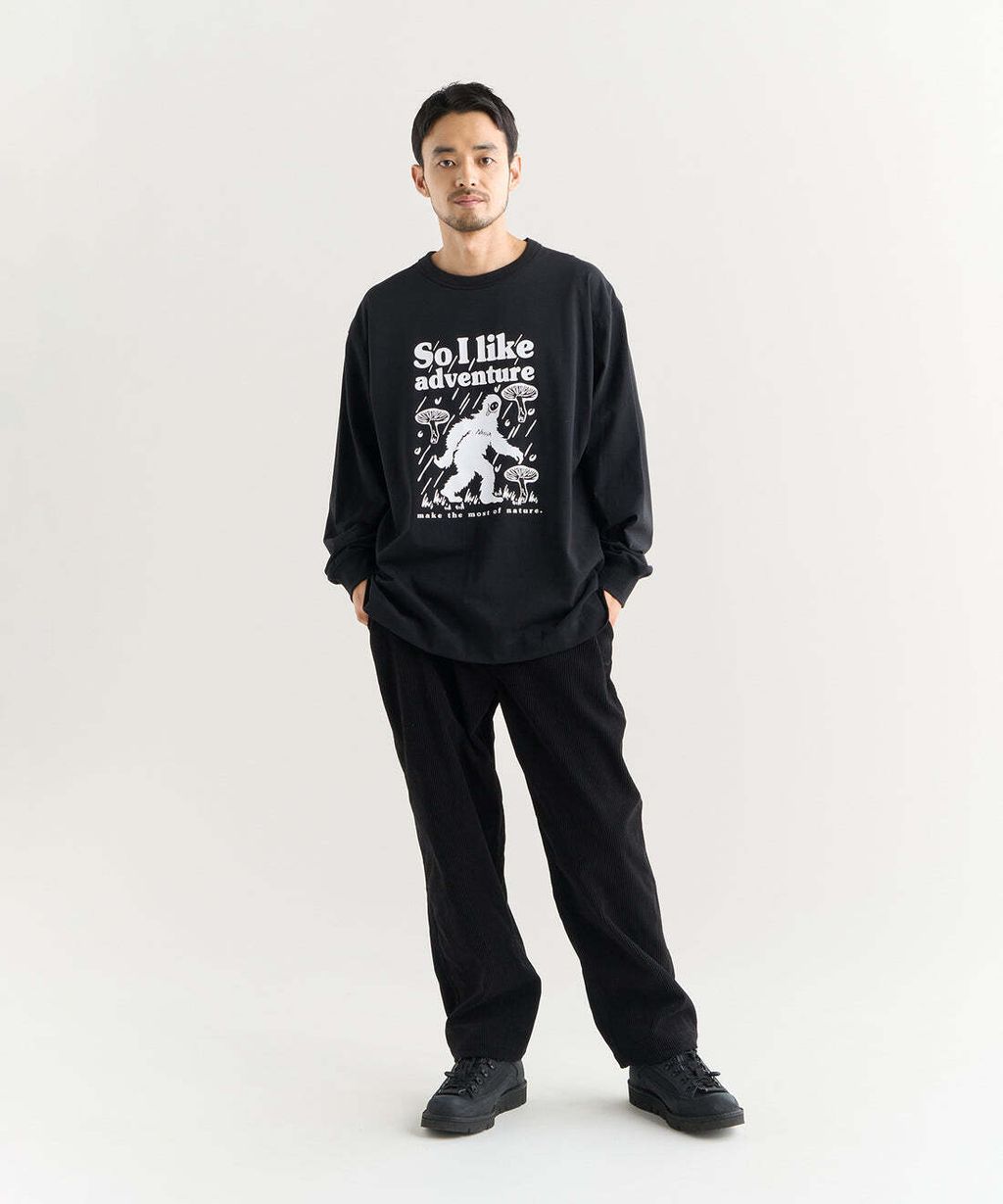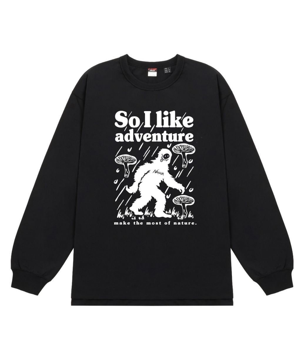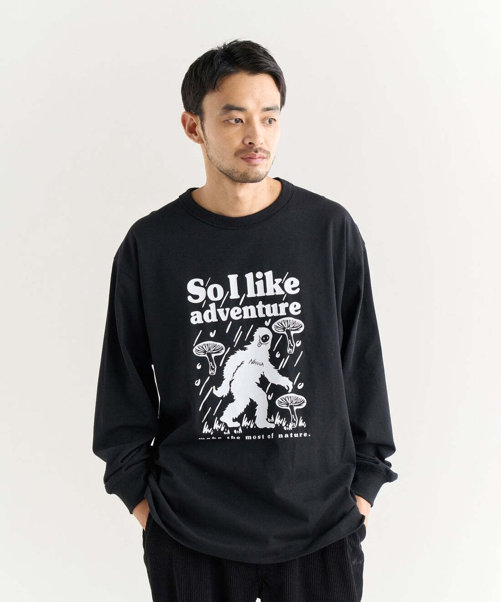 以「對未知的自然保持好奇」為主題,ECO HYBRID L/S TEE / UMA 透過充滿童趣的圖像與字樣展現冒險精神。正面印有「So I like adventure」字樣,搭配雨滴與蘑菇等象徵自然探索的元素,傳遞自由與挑戰的態度。