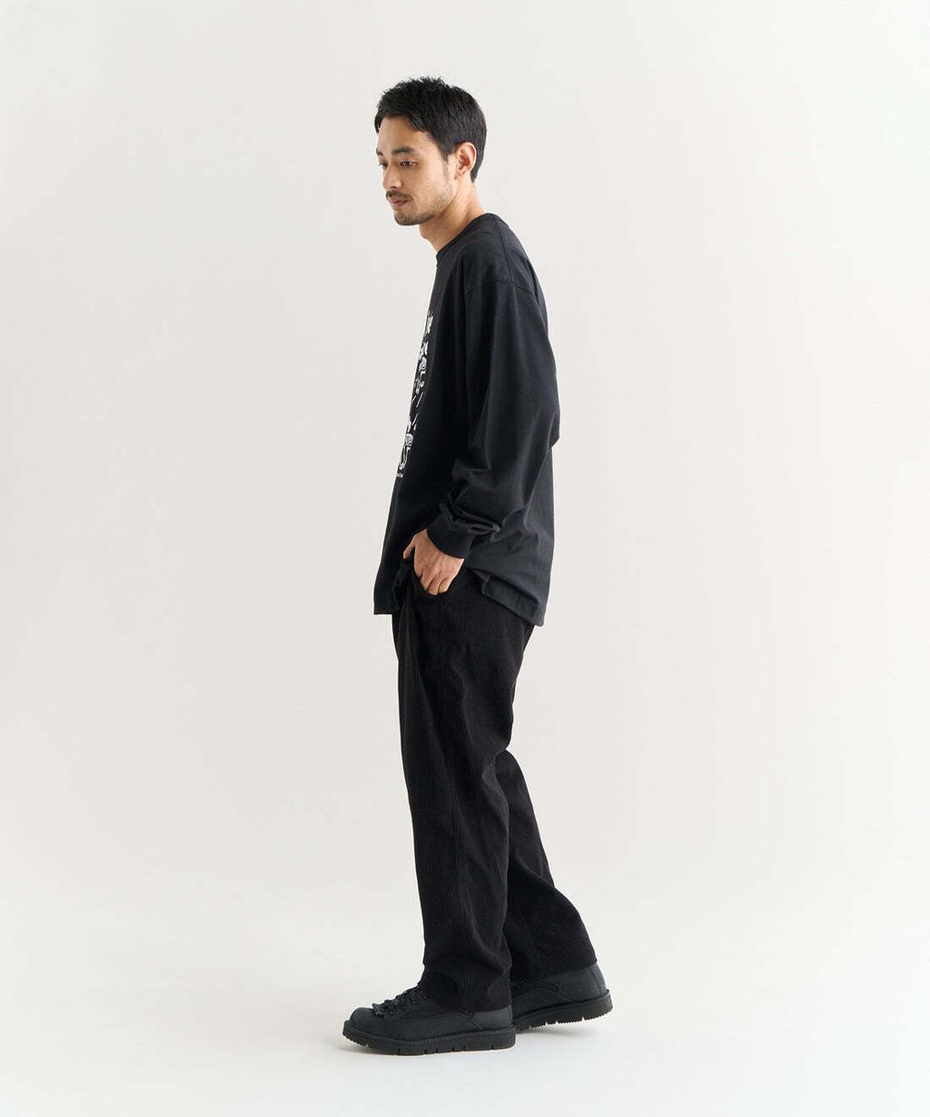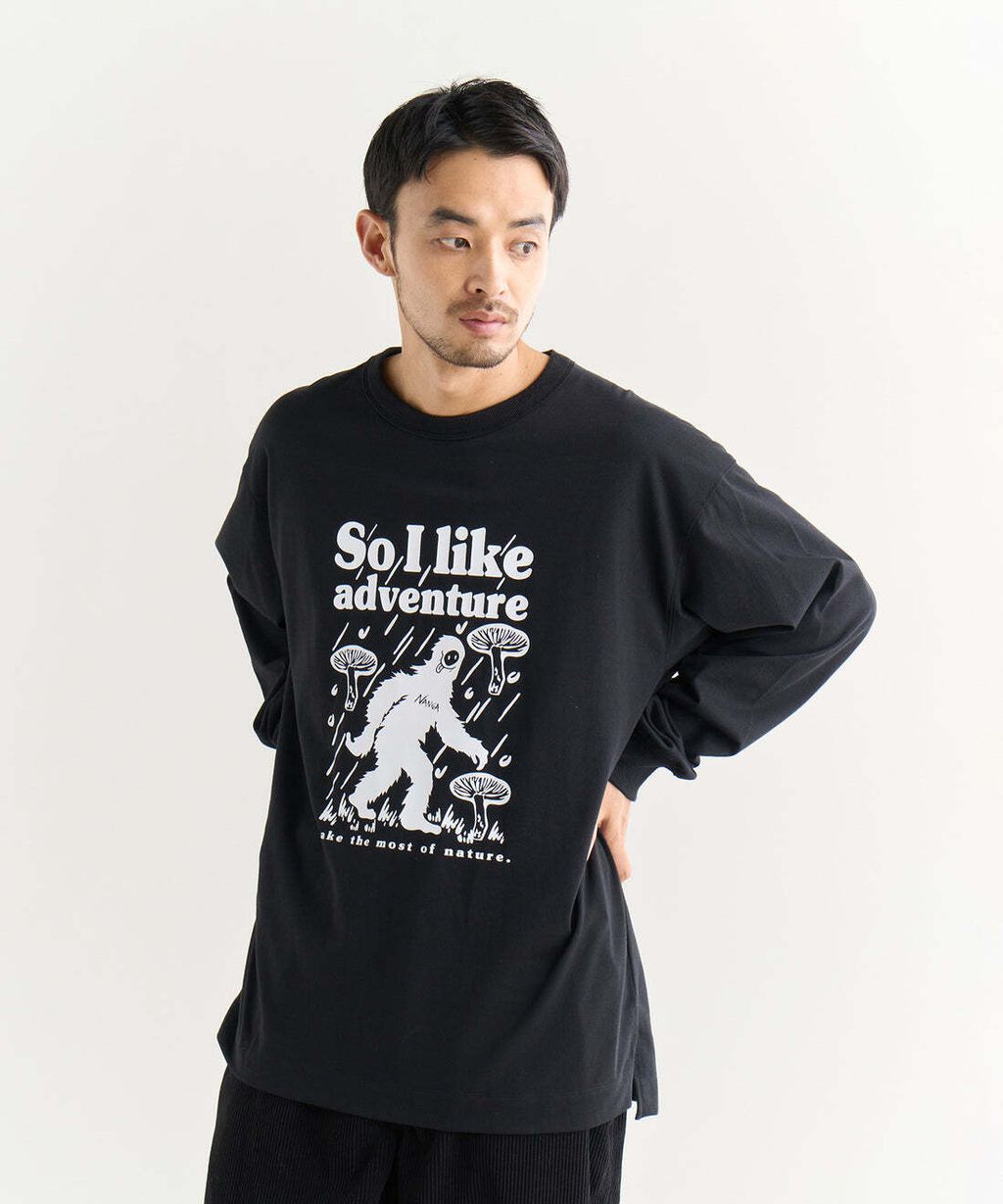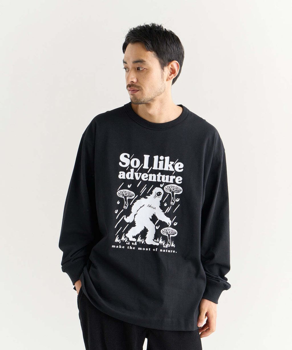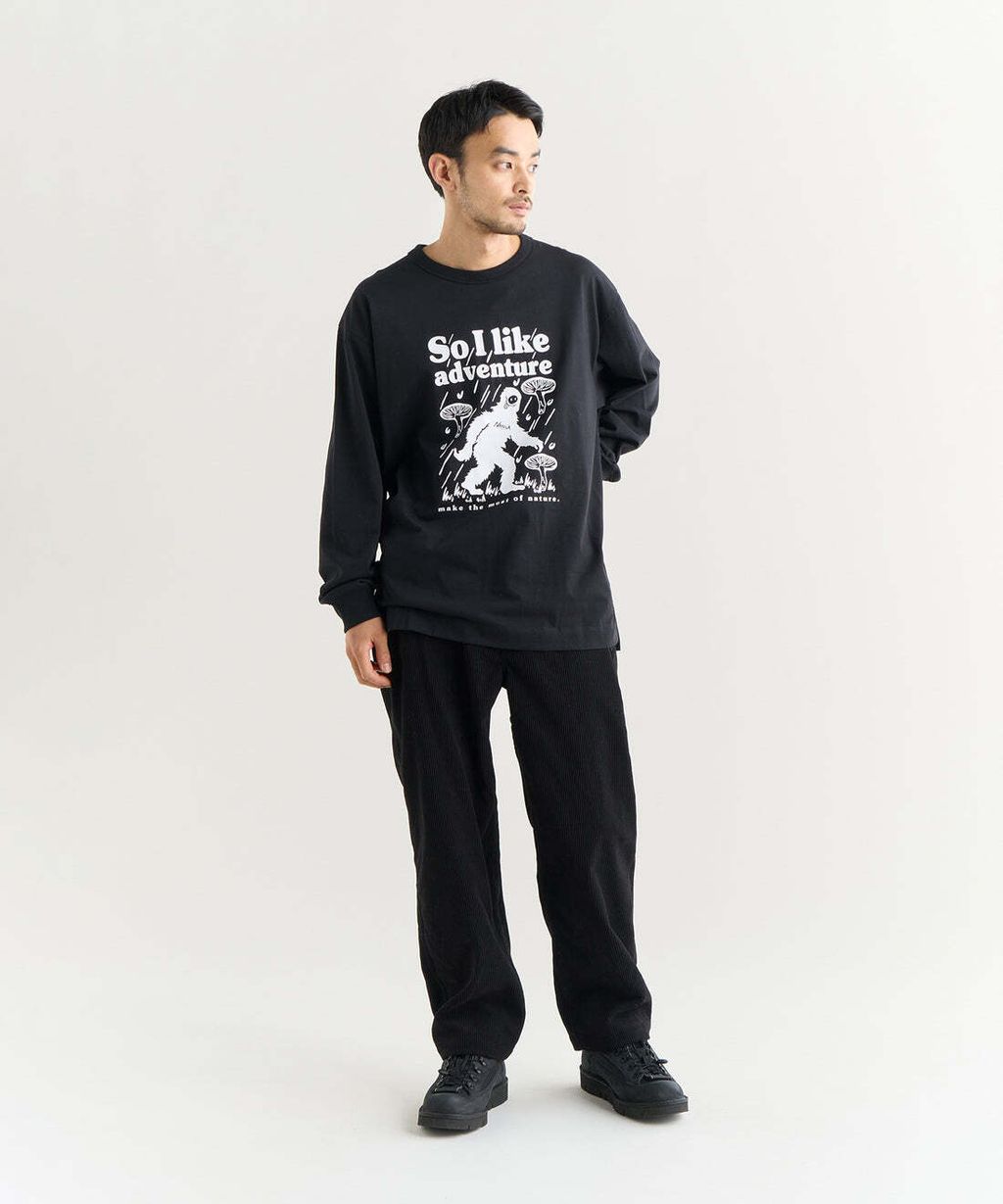 以「對未知的自然保持好奇」為主題,ECO HYBRID L/S TEE / UMA 透過充滿童趣的圖像與字樣展現冒險精神。正面印有「So I like adventure」字樣,搭配雨滴與蘑菇等象徵自然探索的元素,傳遞自由與挑戰的態度。