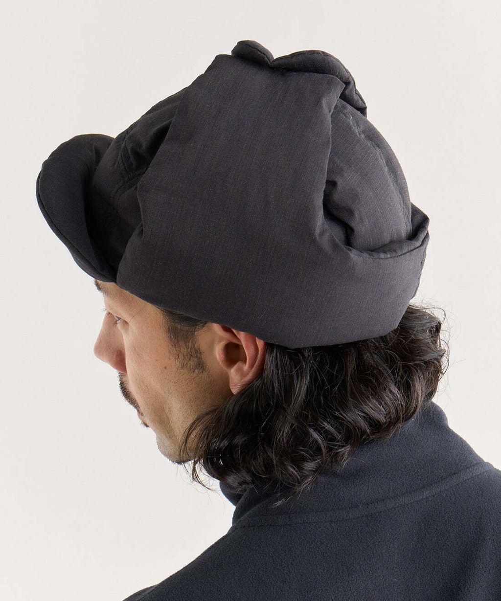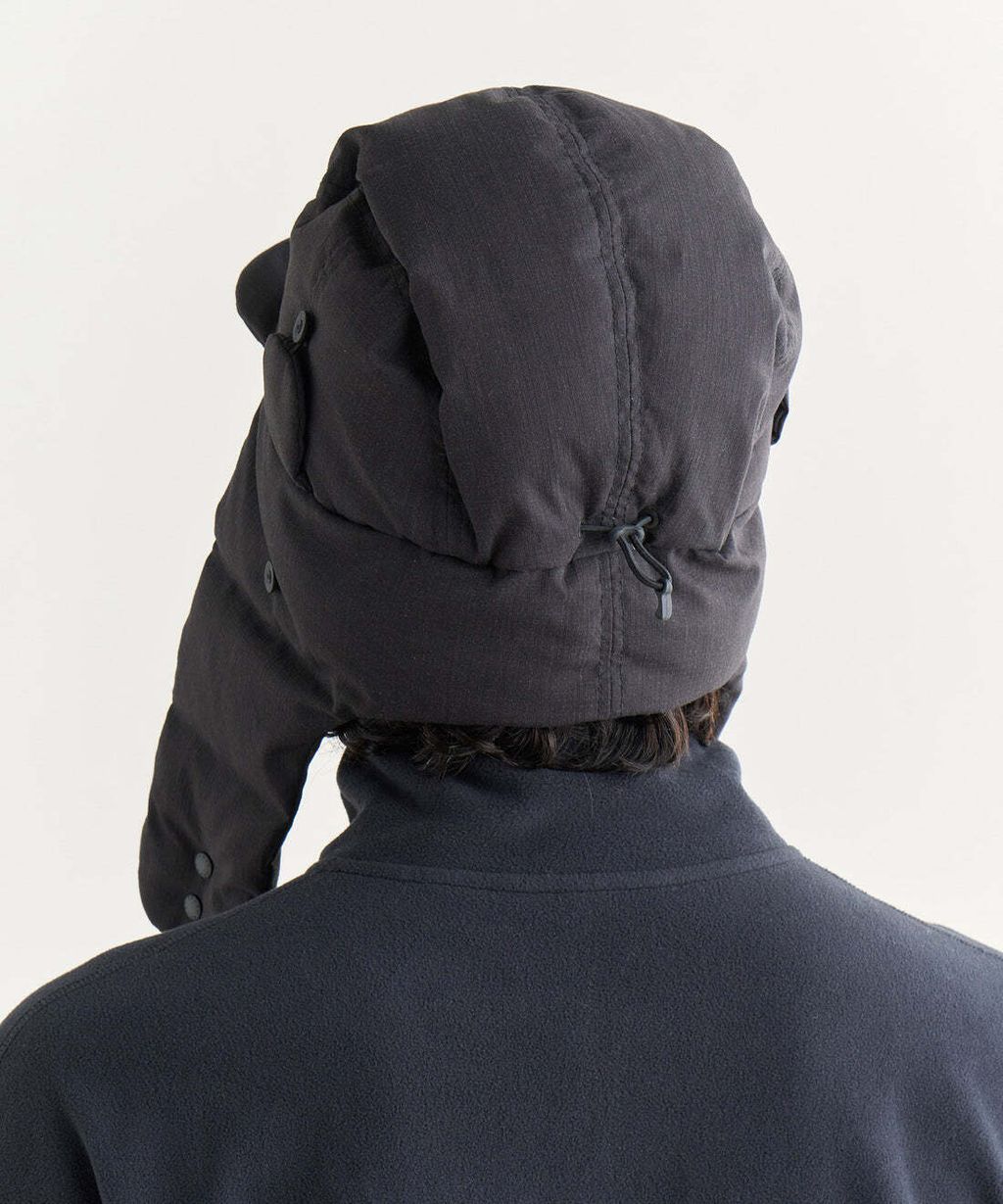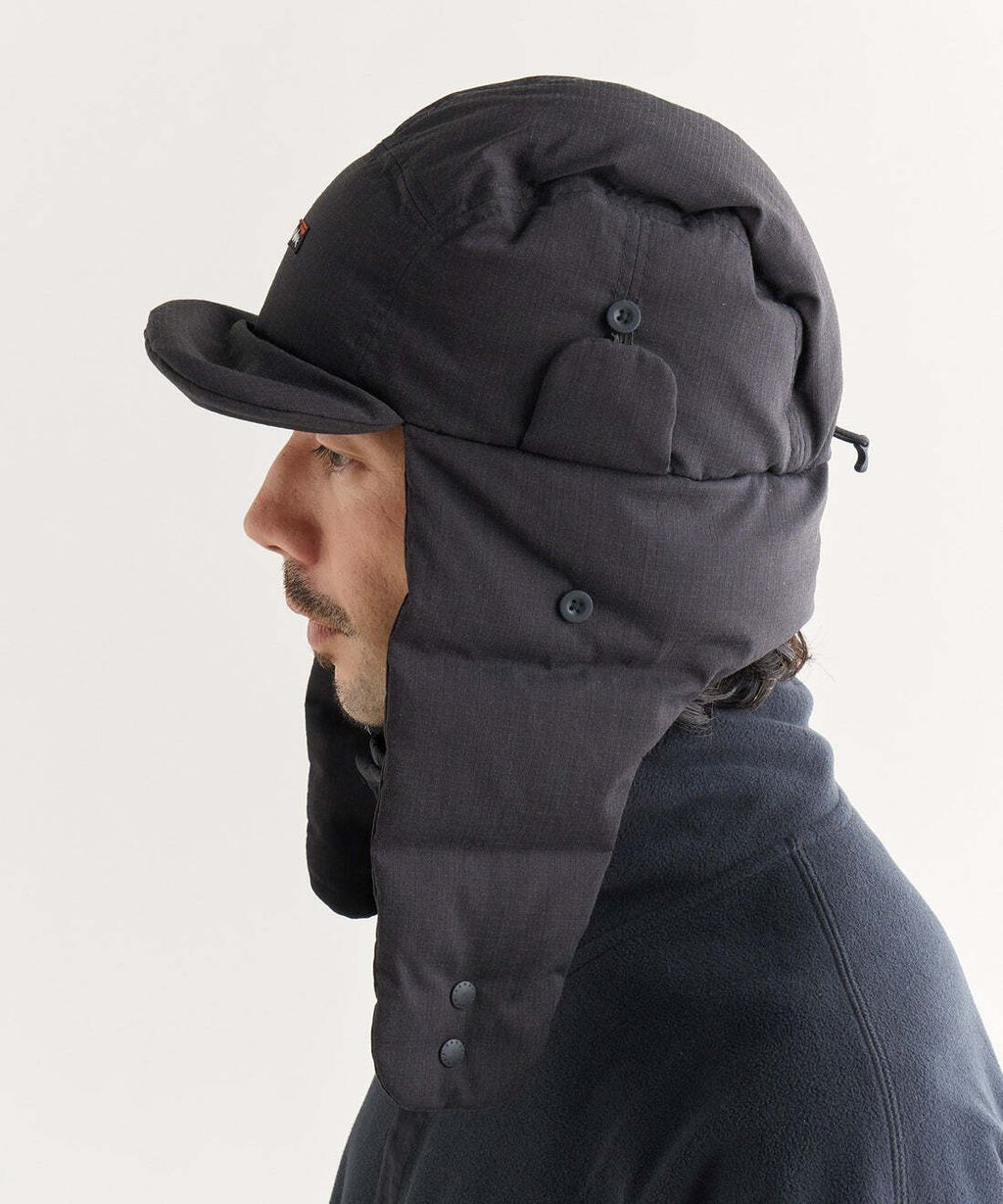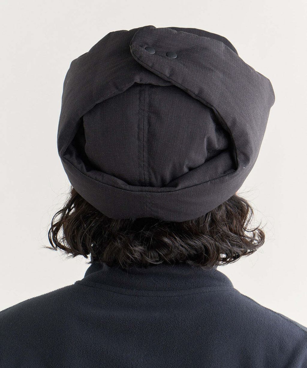 以難燃材質為表布製成的羽絨保暖帽。為減輕重量而使用HINOC RIPSTOP為表布製成的羽絨保暖帽。以Re:CYCLE DOWN (650FP) 的羽絨填充製成兼具防寒與實用性的HINOC RIPSTOP DOWN EAR FLAP CAP,設計上頗具份量感,兩側遮片能完整包覆耳朵與臉部周圍。將兩側遮片解開就能當做日常生活穿搭使用的單品,是戶外活動與休閒皆實用的防寒單品,泛用性強,不分性別皆適用。