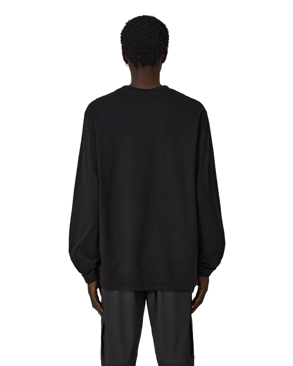 此款長袖 T-shirt 採用 輕量有機棉質針織布料 製成,呈現黑色基調。胸前以對比色刺繡 Logo 點綴,搭配羅紋領口與彈性袖口,提升舒適度與實穿性。整體為寬鬆版型,適合日常穿搭與休閒造型。